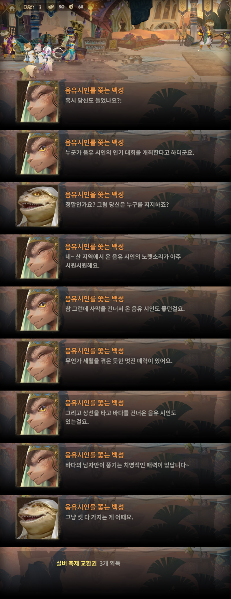 (바로 왼쪽에 있는 도마뱀 일족 큰엄마.) 시끄러운 백성 (아들 소개 운운.) (골든 10개) (DAY: 1과 DAY: 3에만 나타난다고 한다. 모든 이벤트를 다 볼 수는 없기 때문에 이 루트를 꼭 고집하지 않는 게 좋다. 아래의 골든 축제 교환권 이벤트들이 발생하지 않게 된다.) →