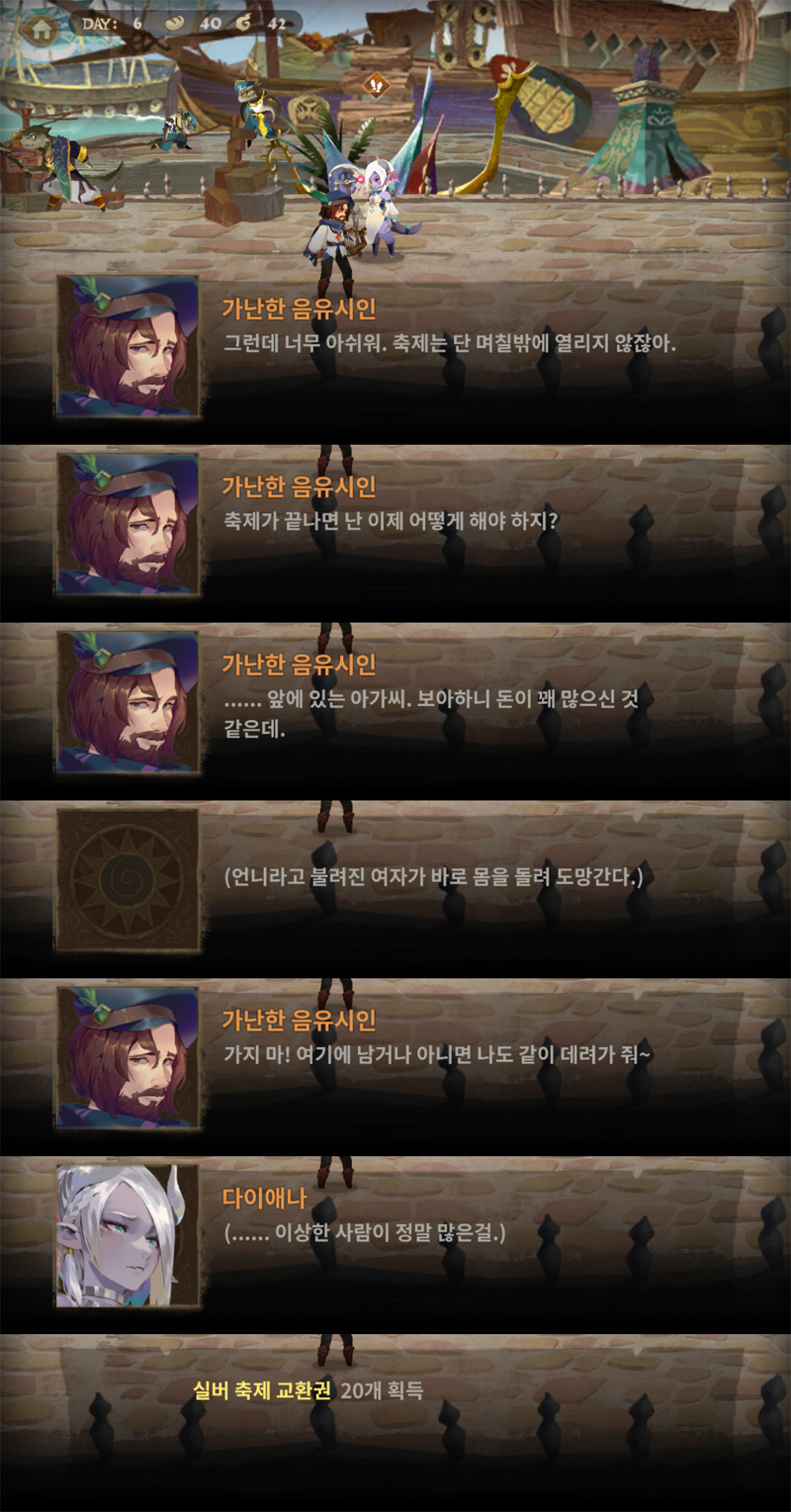 (표지판을 터치해서 항구로 향한다.) (여성 음유시인을 희롱하는) 거친 선원 (가난한 음유시인이 끼어들어서 혼내준다.) (실버 20개) →