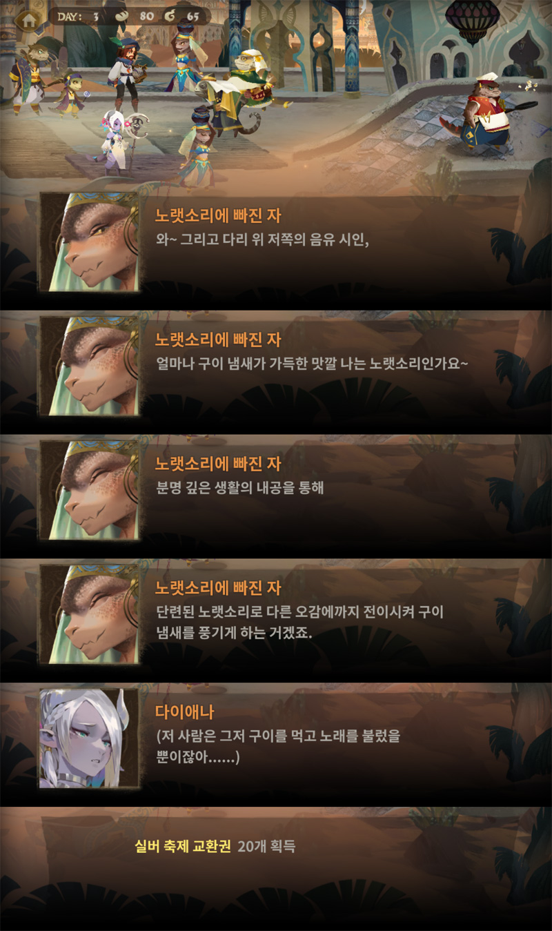 (필수 스토리 이벤트. 스킵. 오른쪽에 있는, 항아리를 머리에 인 여인.) 노랫소리에 빠진 자 (실버 1개) →