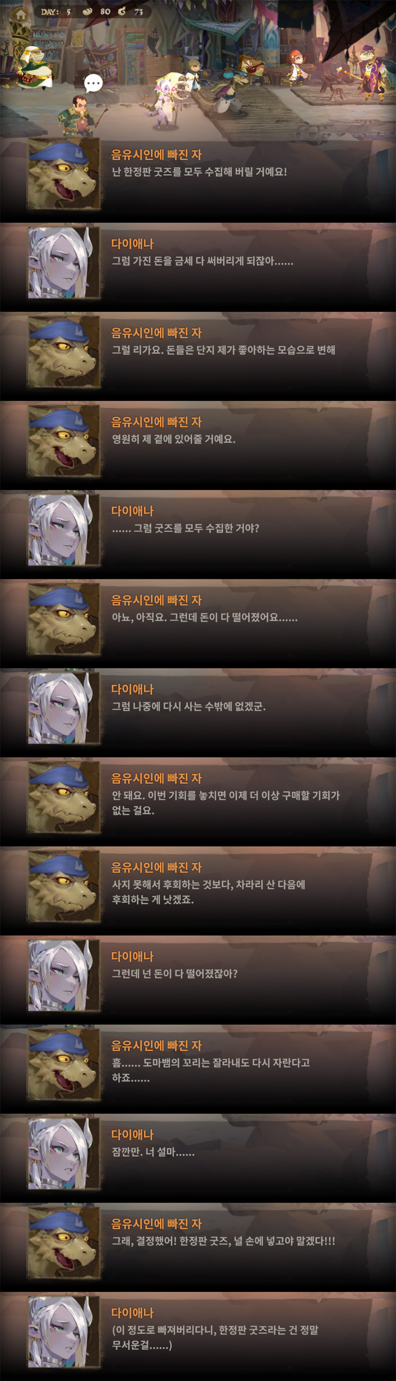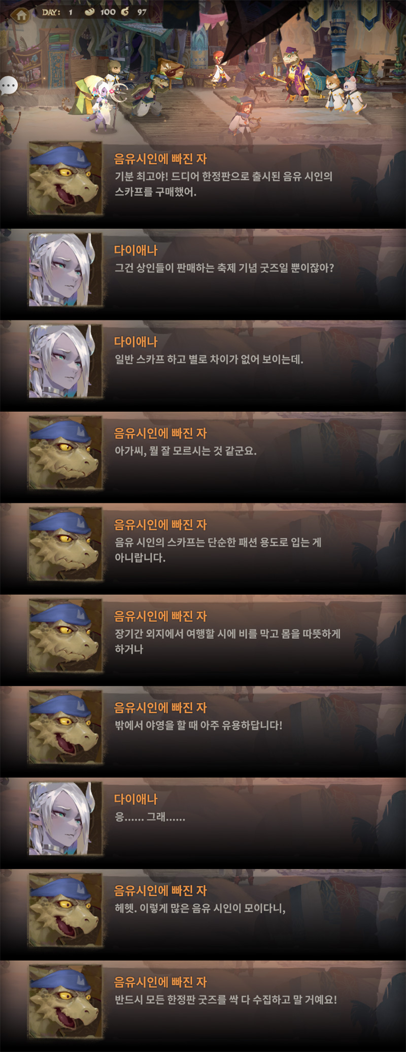 (맨 오른쪽으로 쭉 간다. 보라색 옷.) 부유한 도마뱀 수인 (옷 한 벌 값이 뱃사람의 일 년 치 봉급 운운.) (골든 10개) →