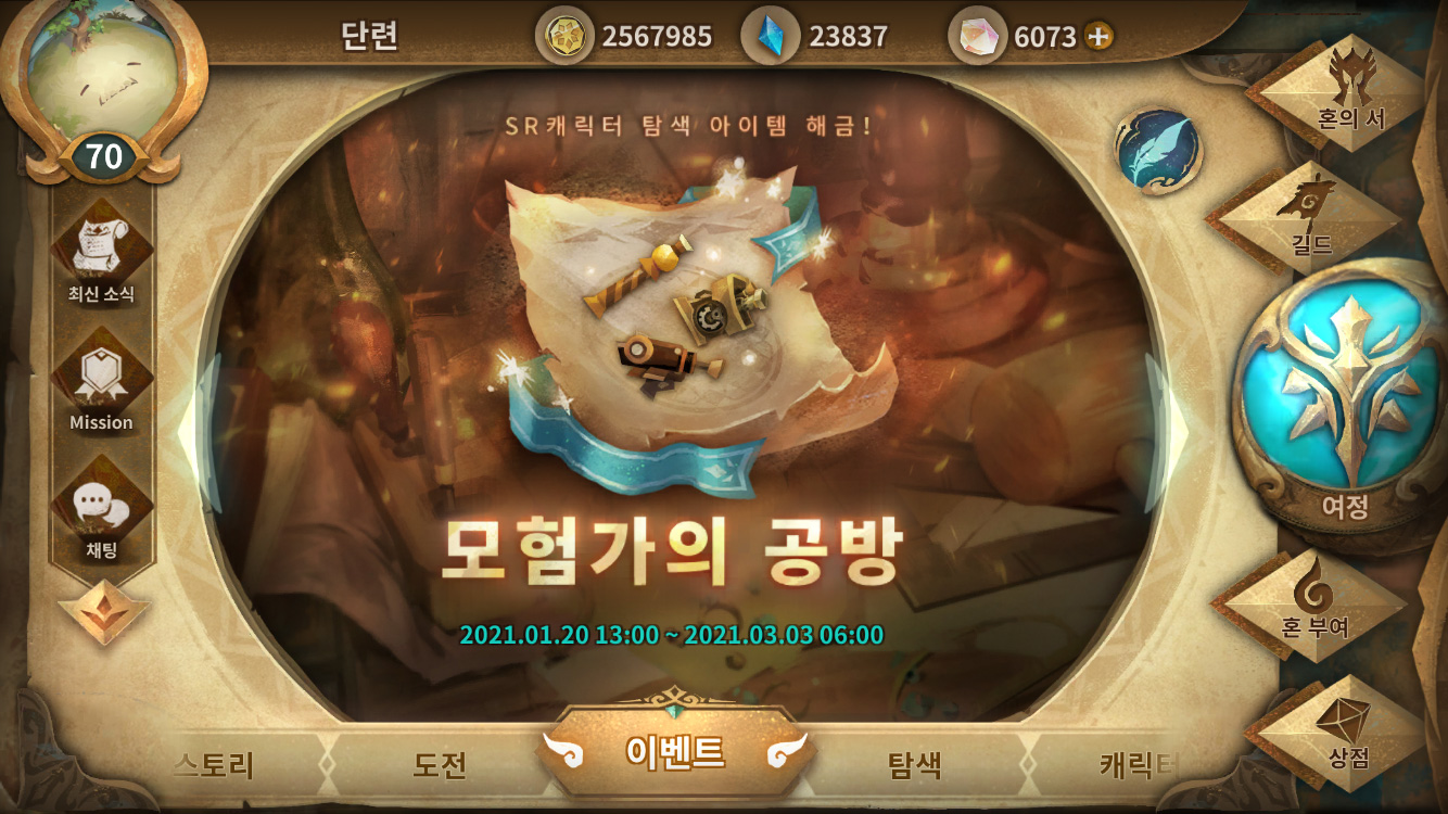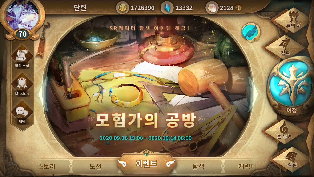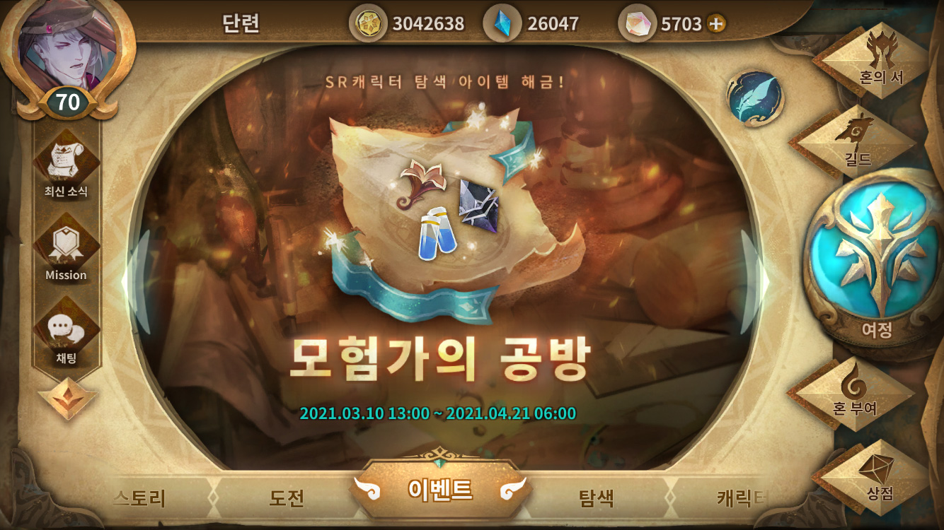 [Hard] 환상세계의 시련 → [Hard] 피난처 → [Hard] 눈에는 눈 → [Special] 몰락 귀족 (자한의 R 장비 브론즈 바람총, 크리스탈 원석 25개 획득 → 그렇다 → 강화가 붙은 혼을 사용하면 즉사당한다. 참모 [시온MZ]를 데려가면 좋았을 듯. 없더라도 장기전으로 가면 이길 수 있다. 자한의 SR 장비 화려한 바람총 합성 공식 해금, 크리스탈 원석 50개 획득)