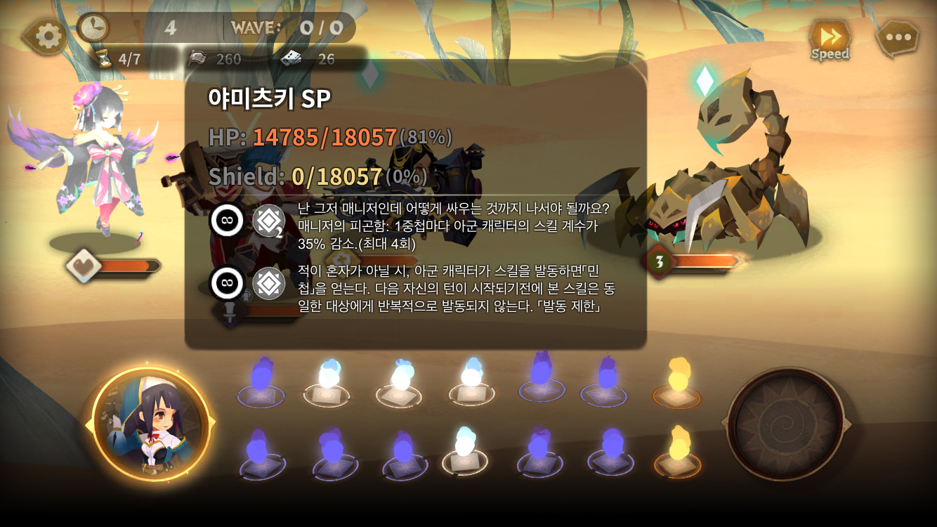 SP 캐릭터가 없다면 ① 참모 혹은 길드참모로 적만 공격하는 참모 캐릭터인 나야 혹은 네드 혹은 묘안 혹은 야미츠키 혹은 팡을 반드시 데려갈 것.