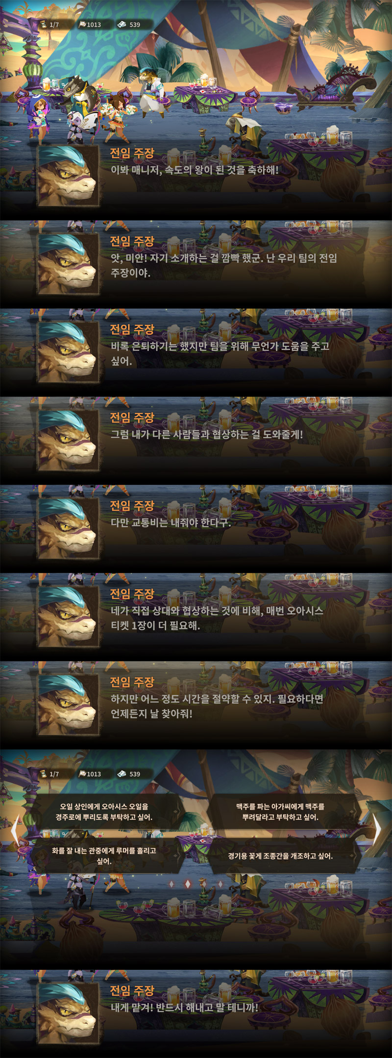 ※ 만약 푸찌 랜덤에 걸려서(?) 1위를 놓쳤다면 얼른 좌상단의 톱니바퀴 아이콘을 눌러서 다시 시작. 오일 상인에게 가서 오아시스 오일 구입, 라운지로 가서 꽃게 개조를 한 뒤에 우리 팀 기수에게 오아시스 오일을 주면 된다. (16장)