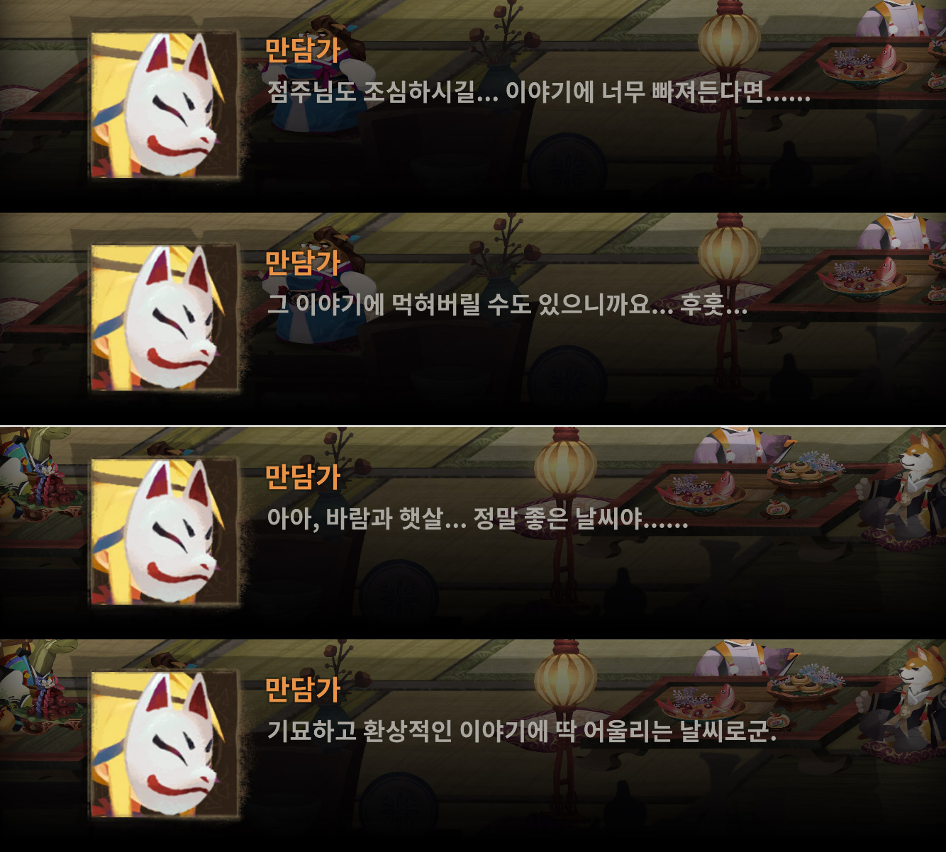 객잔 조수 "요즘 동료들 가운데 일이 고되고 재미없다는 불평이 나오고 있습니다. 만일 이런 사실이 손님의 귀에 들어가기라도 하면, 객잔의 명성에 영향을 줄 수 있습니다......"