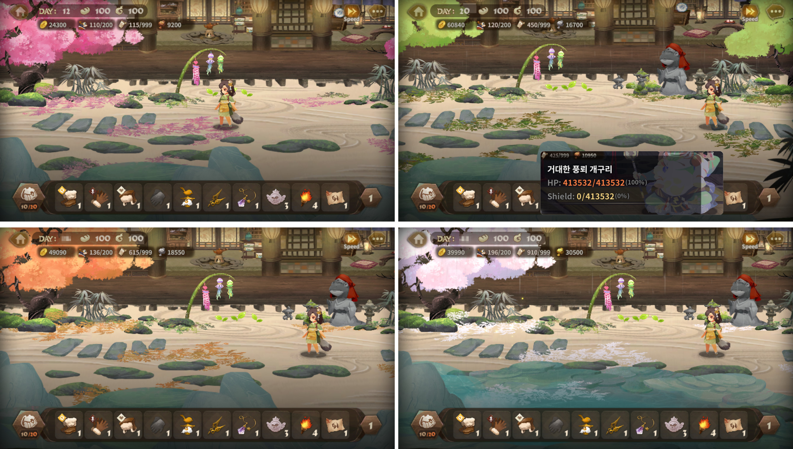 2. 노란색 마크가 뜨는 식당, 온천, 상점가, 연회장 등등을 순찰하며 (회색이라서 잘 안 보이는) 개구리 석상을 터치해서 이벤트를 본다. → 게임을 마치면 전투 발생 및 점주가 잠에서 깨어나는 이벤트 발생. 《사계절 춘천의 주인》에서, 여름의 [기묘한 석상 사건] 클리어.