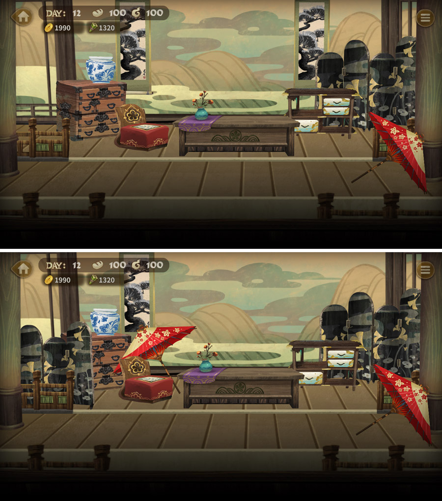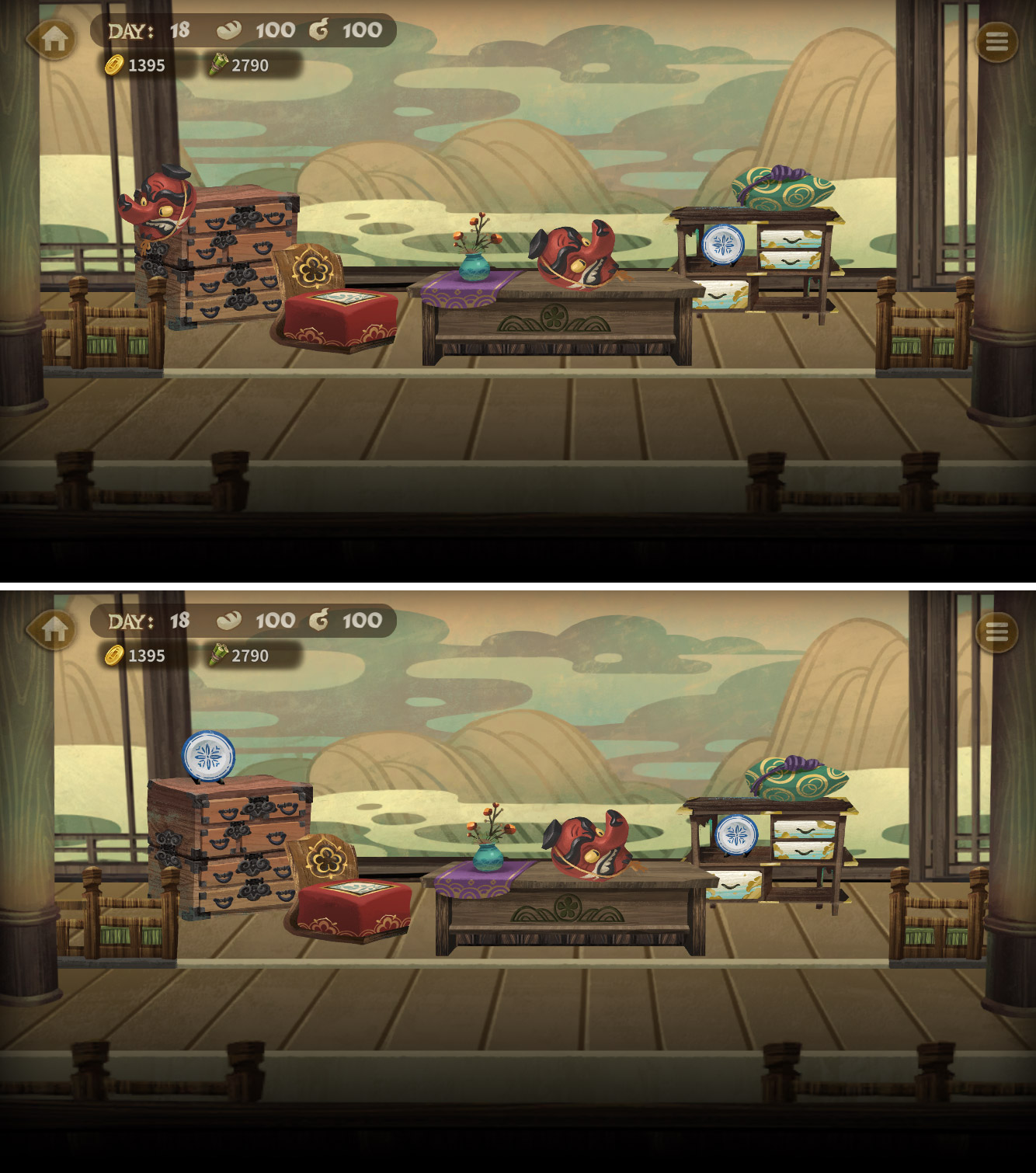 이 물건들 중 수량이 변하지 않은 것은? (그릇, 등, 마네키네코, 방석, 찻주전자 중 한 가지를 선택한다.)