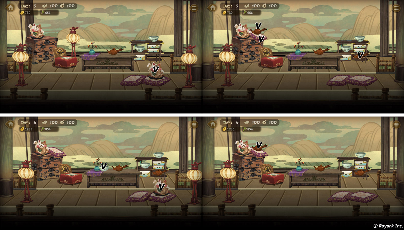 조수에게 '손님 상황'을 물었을 때 대답해주는 노점 앞에는 금색 복고양이가 있다. 미식가들(간이 음식 판매대), 이야기꾼의 팬들(이야기꾼 노점), 활기찬 아이들-다채롭고 흥미로운 노점(반딧불이 노점), 달달한 연인들-예쁘고 시원한 곳(금붕어 건지기).