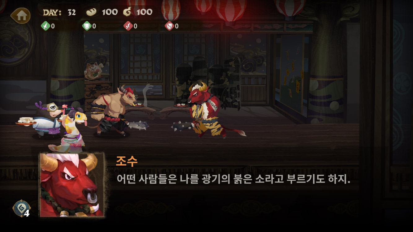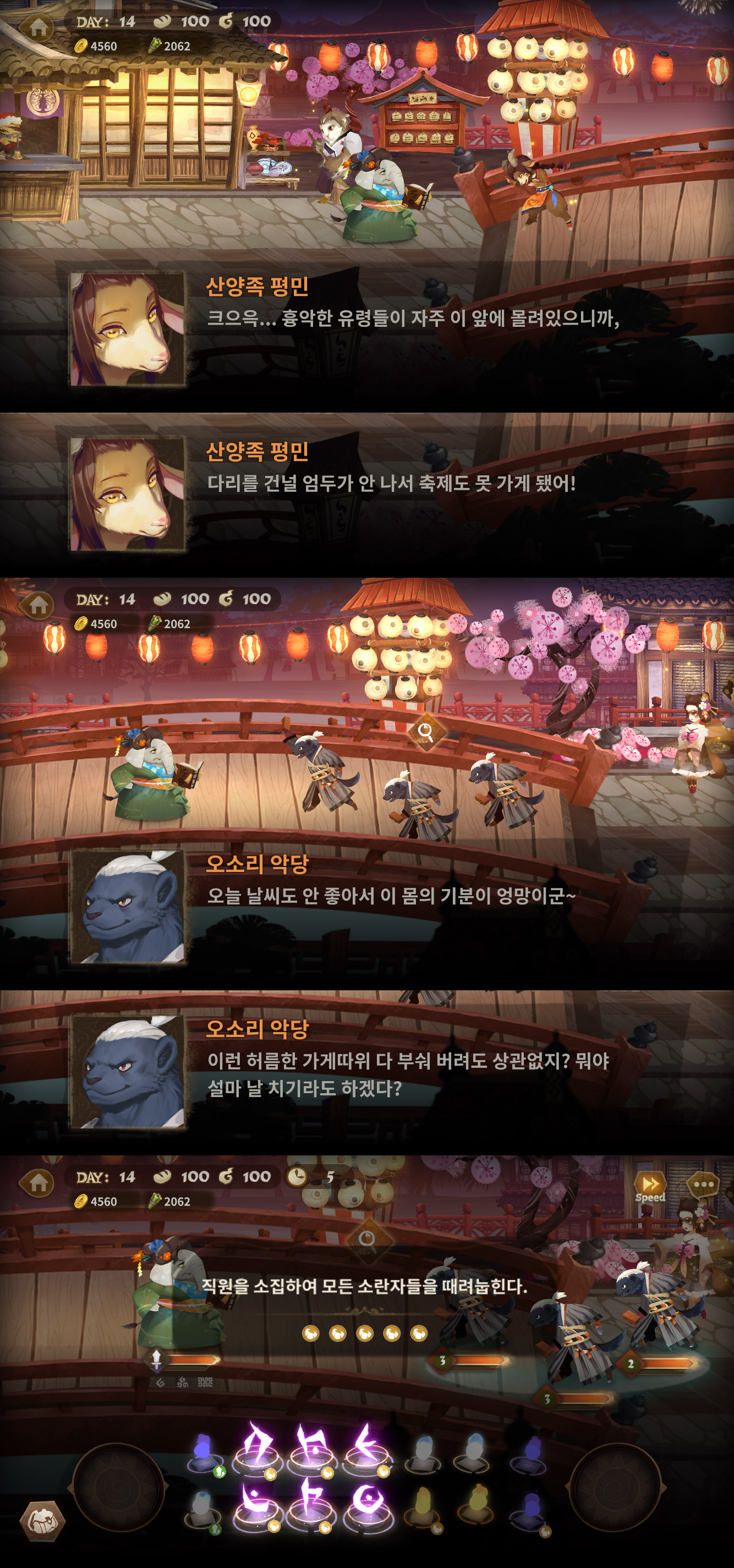 (설치한 노점) 노점 업그레이드 · 점원을 파견하여 노점을 돕게 한다 (※ 겁쟁이 생쥐, 청록색 뱀장어, 미친 흑소(둘째)는 제외할 것.) →