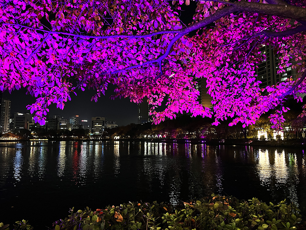 개인적으로 루미나리에보다 보랏빛 조명을 비춘 벚나무가 더 아름다워 보였어요.